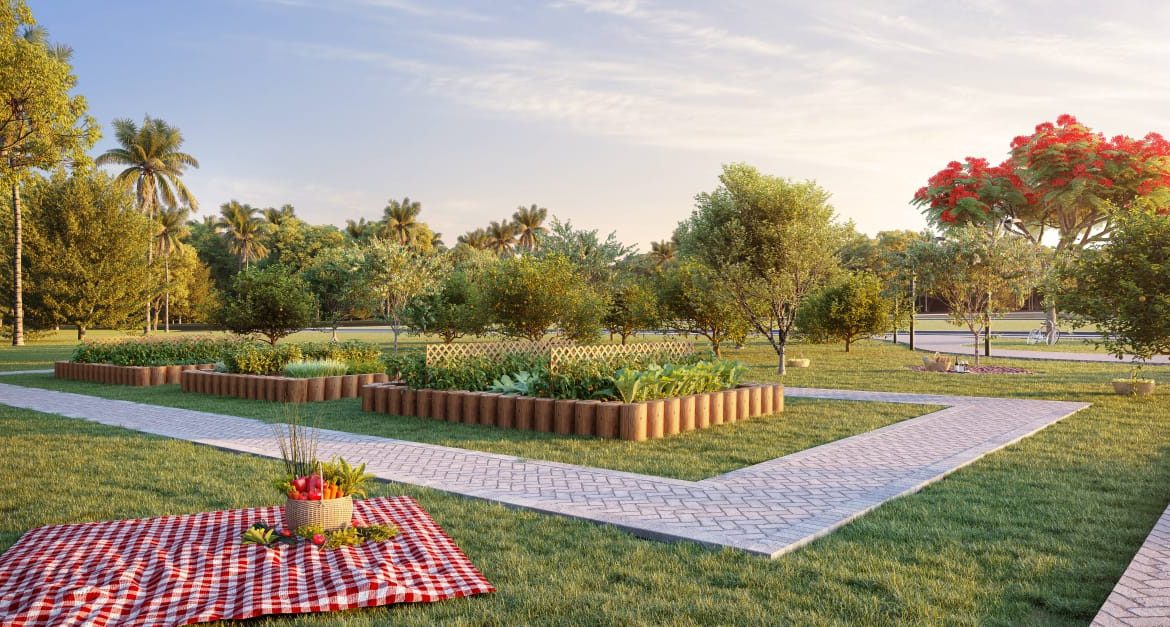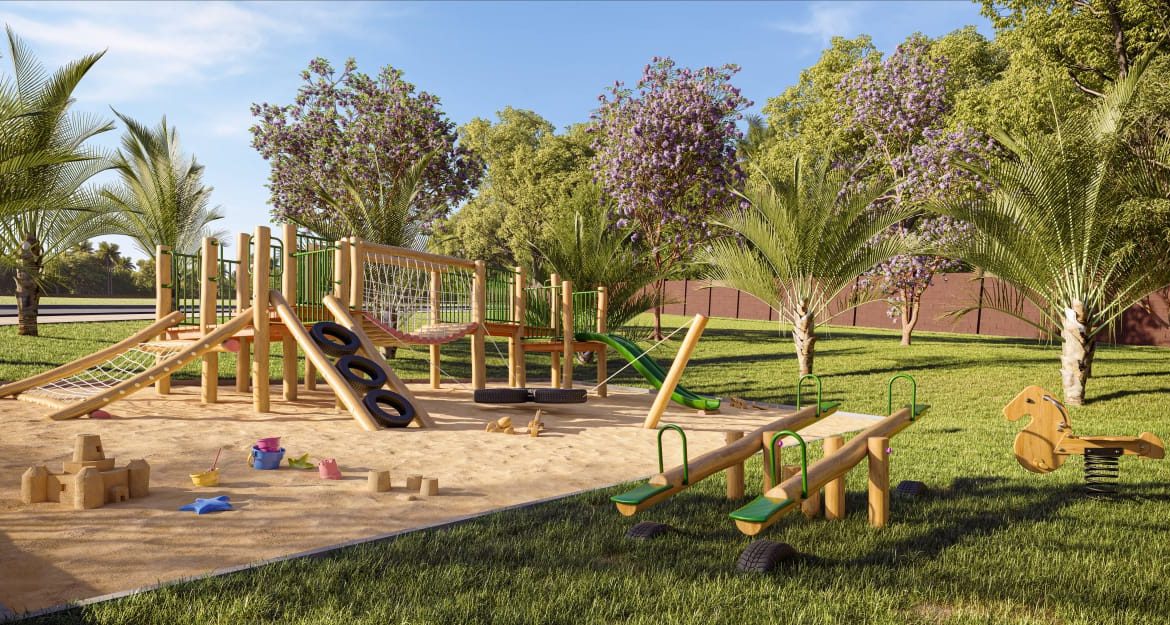 Portaria de acesso com segurança 24h, academia, espaço feira, horta, piscina, playground, quadra de areia, quadra society, quadra de tênis, quiosque.